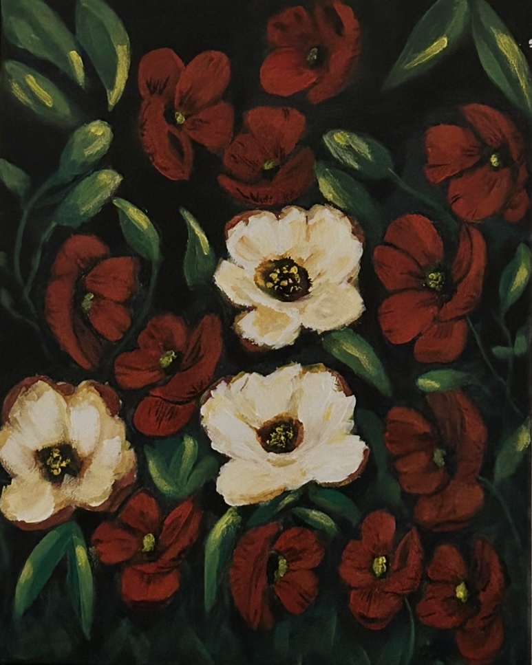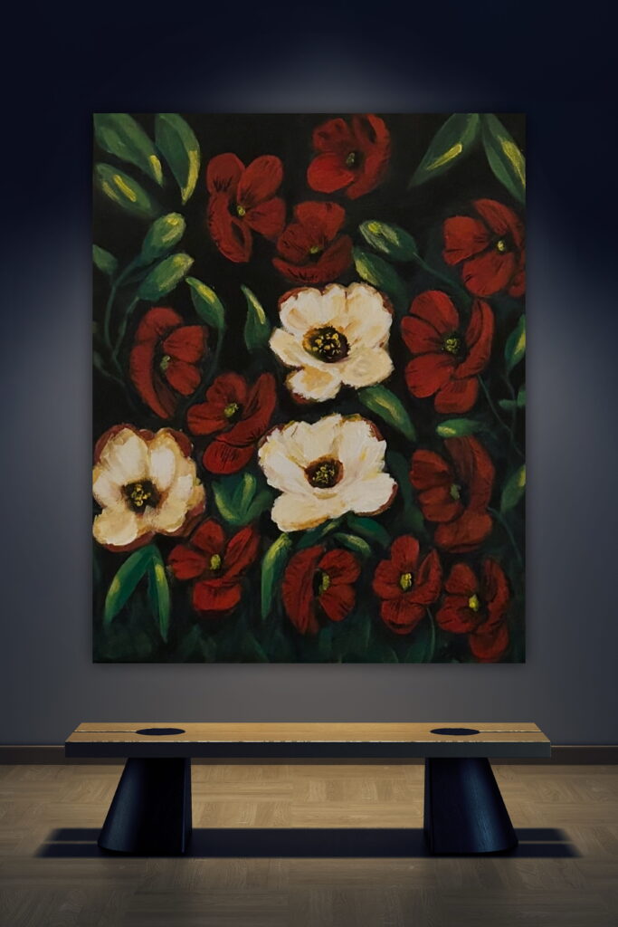 Serene nocturne: Serene nocturne of red and white blossoms weaving against the deep shadowed night. Out of the darkness into the light. This is an original painting on 16 * 24 canvas, abstract acrylic and mixed media.
