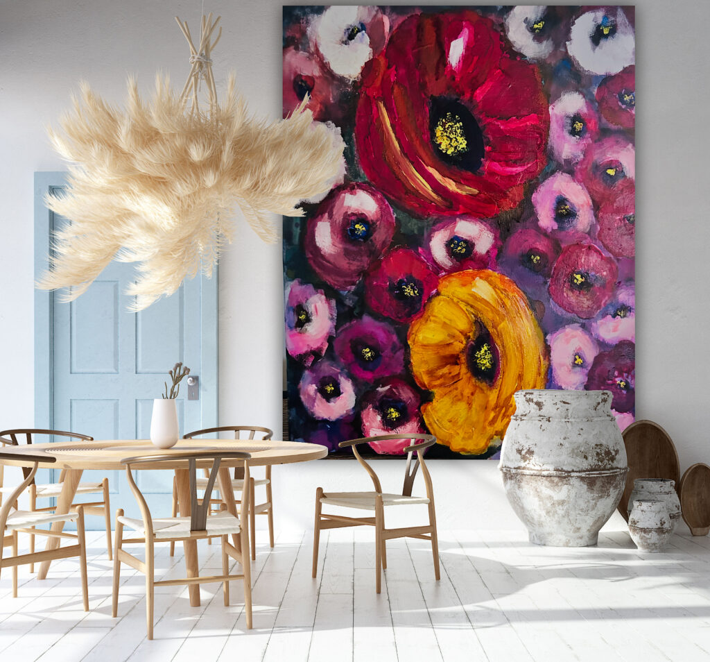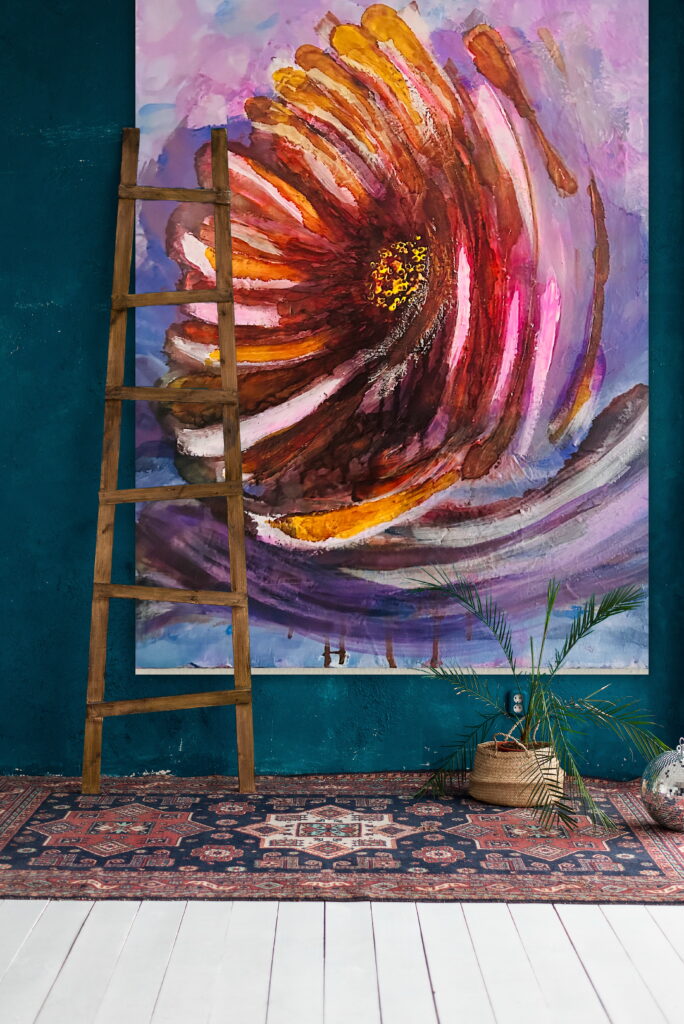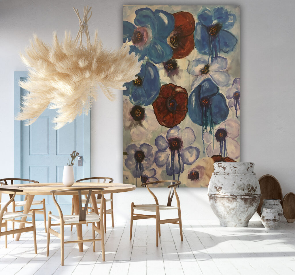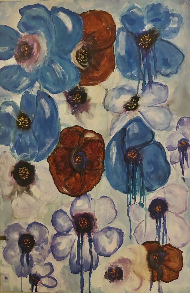 Life reimagined is a bold piece, with large expressive flowers in rich shades of blue, rust and white creating bold contrast’s in abstract style. This piece has a sense of movement and spontaneity that speaks of freedom, nature unbound and wild. Life reimagined is an original painting on a 24*36 canvas, abstract acrylic and mixed media.