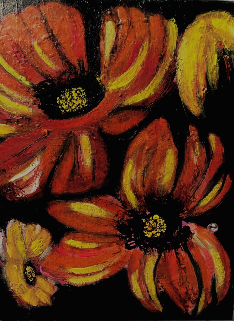 The Fire and the Quiet: An invitation to pause and reflect on the fragile, fleeting beauty of growth and change. The blooms pushing outward with energy, yet also quietly contemplative, a sense of time passing, and reminder on the enduring grace found in nature’s cycles. This painting for me expresses the duality where the intensity of endings collides with the quiet beginnings of something new. The Fire and the Quiet is an original painting on 16 * 24 canvas, abstract acrylic and mixed media.