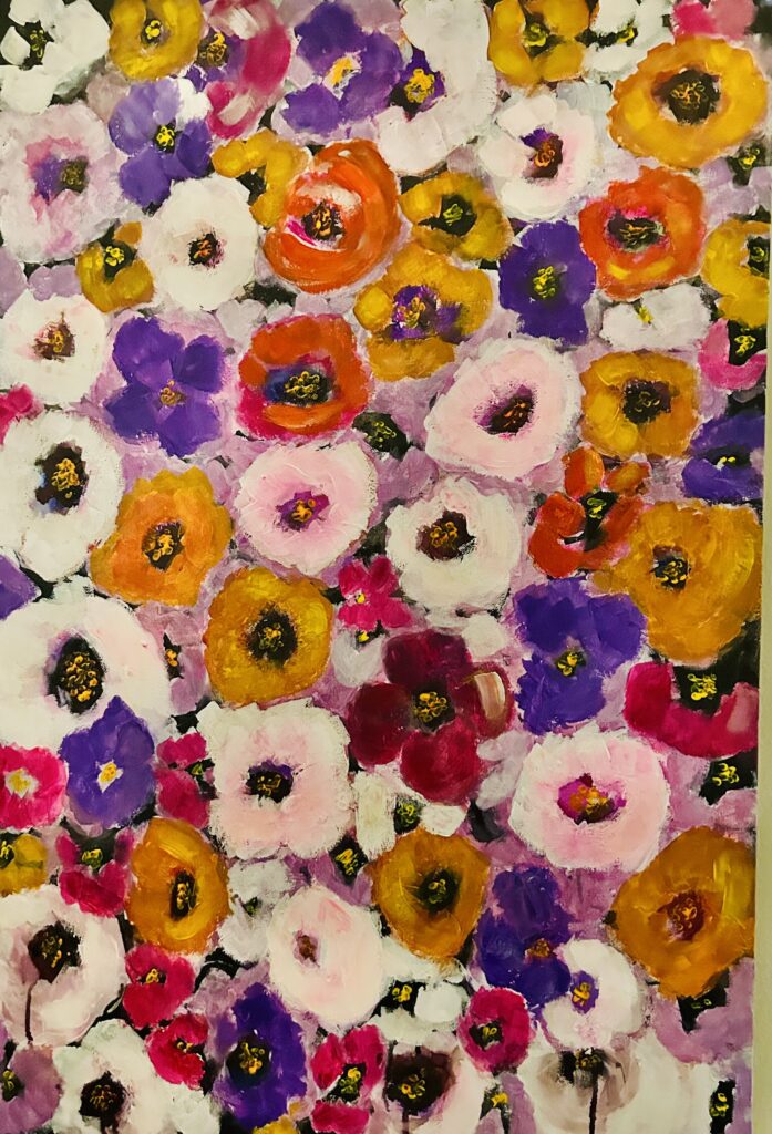 Symphony of Blossoms: This painting inspires a dynamic rhythm, a visual chorus in full bloom and abundance. This is an original painting on a 24*36 canvas, abstract acrylic and mixed media.